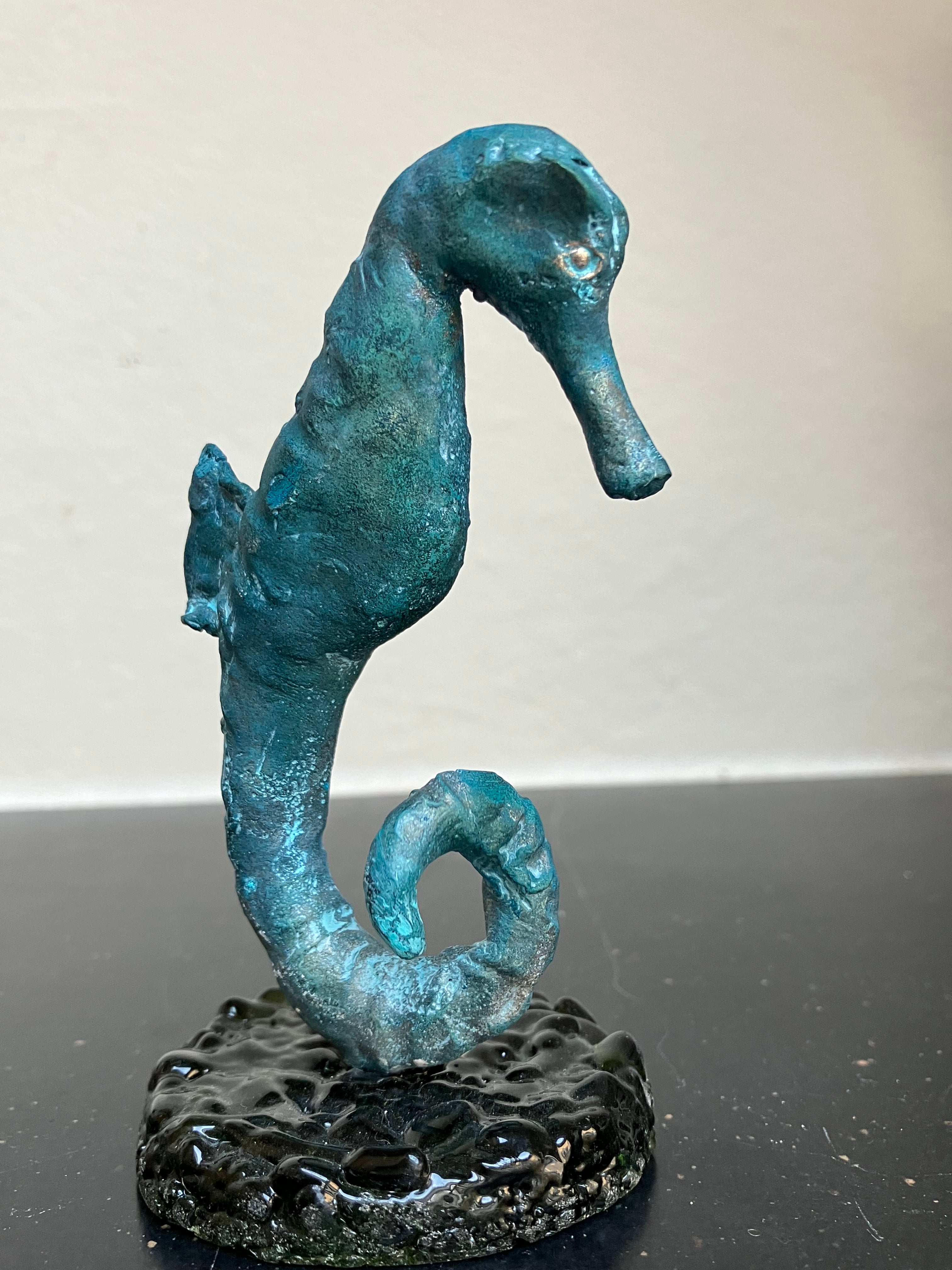 Søhest, pationeret broze på glas, 11 x 6 cm